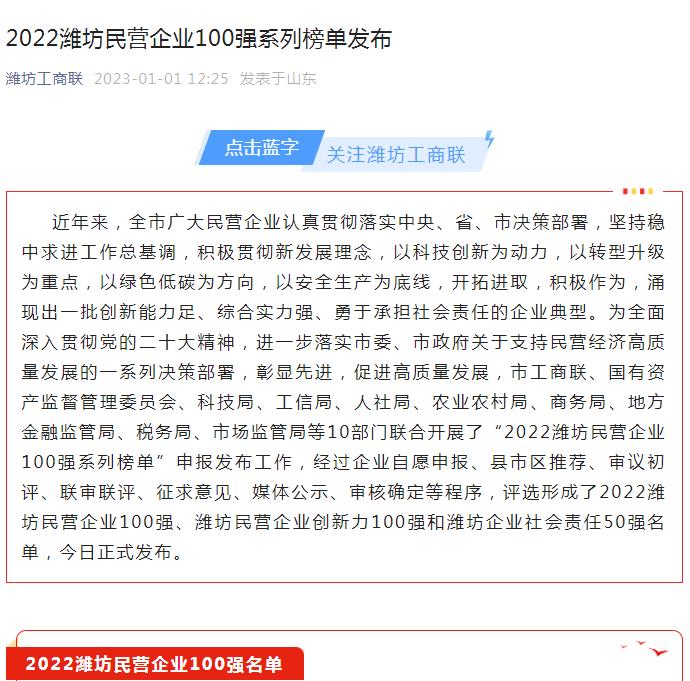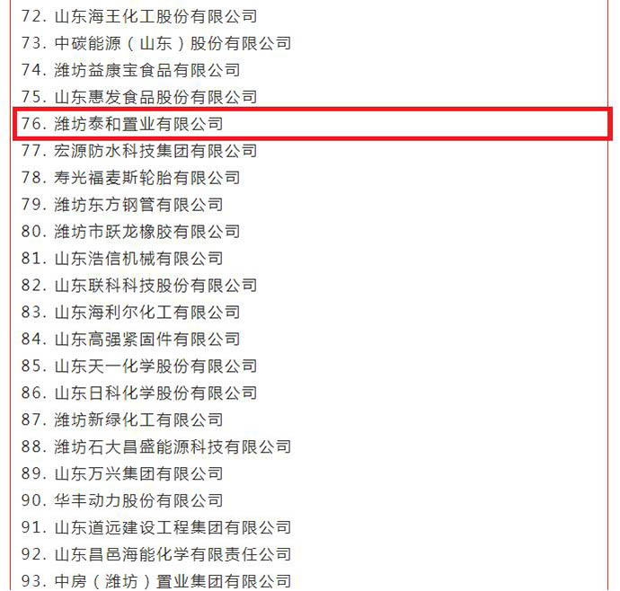 2023年1月1日,濰坊工商聯(lián)發(fā)布了2022濰坊民營企業(yè)100強(qiáng)系列榜單,濰坊泰和置業(yè)有限公司同時(shí)斬獲“濰坊民企百強(qiáng)、社會(huì)責(zé)任50強(qiáng)”兩項(xiàng)榮譽(yù)。