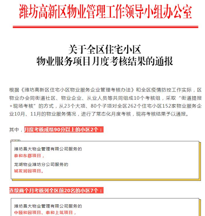 2022年12月21日,濰坊高新區物業管理工作領導小組發布《關于全區住宅小區物業服務項目月度考核結果的通報》,昌大物業服務的泰和東郡、中頤和園、泰和上筑項目在此次全區月度考核中表現突出、位列前茅,其中泰和東郡項目更是在全區262個住宅小區中連續兩個月獲評第一名。