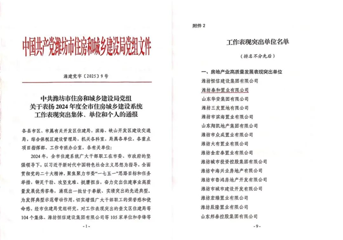 濰坊市住房和城鄉建設局:授予泰和置業“2024年度全市住建系統工作表現突出單位”