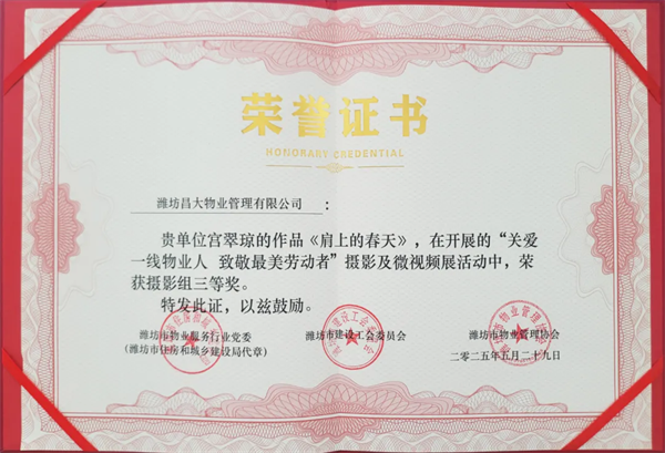 2025年5月30日,在全市物業行業“關愛一線物業人 致敬最美勞動者”攝影及微視頻展活動中,濰坊昌大物業管理有限公司提報的兩部作品雙雙獲獎!《肩上的春天》榮獲三等獎,《平凡微光·匠心守護》榮獲優秀獎,這份雙重榮譽,是對昌大物業企業文化的生動詮釋,更是對全體物業人敬業精神的崇高禮贊!