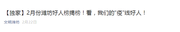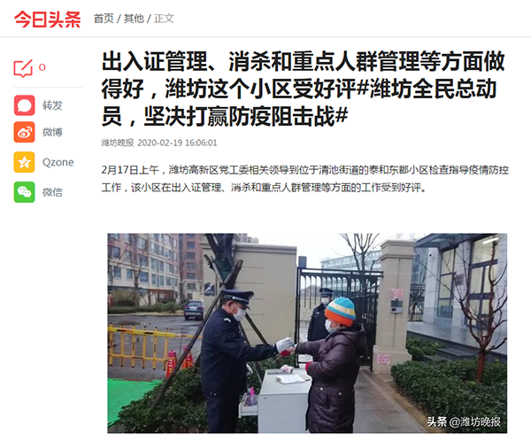 新冠肺炎疫情發生以來,全市各行各業涌現出許多感人至深的“好人”事跡,為凝聚抗疫信心,由濰坊市文明辦主辦了“濰坊好人榜”抗疫好人選拔活動,昌大物業項目經理王磊在帶領團隊防疫抗疫過程中表現突出,入選了2020年2月份“濰坊好人榜”。其管轄小區在區黨工委相關領導檢查過程中,因小區在出入證管理、消殺和重點人群管理等方面的工作受到好評,其做法同時被街道物業辦在各物業項目部推廣學習,并在《濰坊晚報》《今日頭條》等新媒體上進行了宣傳報道。